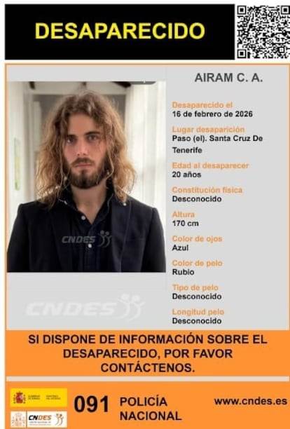 La escarpada isla de La Palma se vuelca en la búsqueda de Airam Concepción, el joven autista de 20 años desaparecido a las 16.36 del 16 de febrero, en plena celebración del Carnaval. La semana de incesantes rastreos por tierra y mar no han logrado dar con el paradero del joven, visto por última vez bajándose de una guagua en Santa Cruz de La Palma (este de la isla) con una mochila negra. El rastro de su móvil se perdió más tarde en la aledaña localidad turística de Los Cancajos. Desde entonces tampoco se han producido movimientos en su tarjeta bancaria ni en su bono de guaguas. La Guardia Civil ha confirmado a la Cadena SER que reducirá la intensidad de la investigación a la espera de nuevas pistas. El instituto armado ha solicitado que quien pueda tener información se ponga en contacto con los teléfonos 062 o el 922437650.