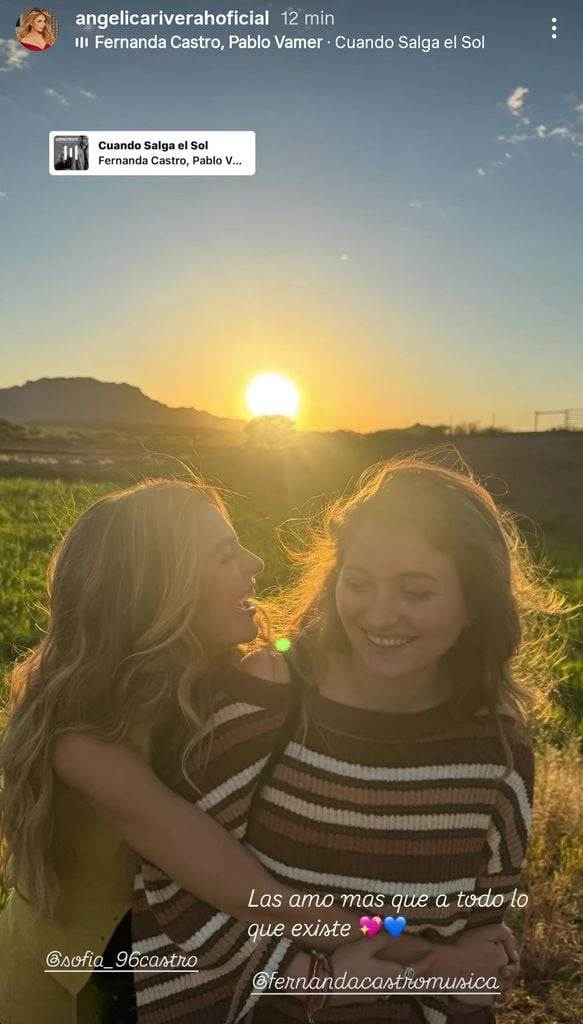 ‘La Gaviota’ publicó después una nueva foto con la que reveló que otro de sus retoños estaba con ella y Sofía: Fernanda. “Las amo más que a todo lo que existe”, escribió Rivera. Junto a esta declaración de amor maternal, la actriz publicó una instantánea de sus hijas abrazadas y riendo en medio de un campo, con el sol ocultándose en el horizonte. Este post lo ambientó con la canción perfecta: Cuando Salga el Sol, tema que Fer lanzó en 2023 junto a Pablo Vamer.