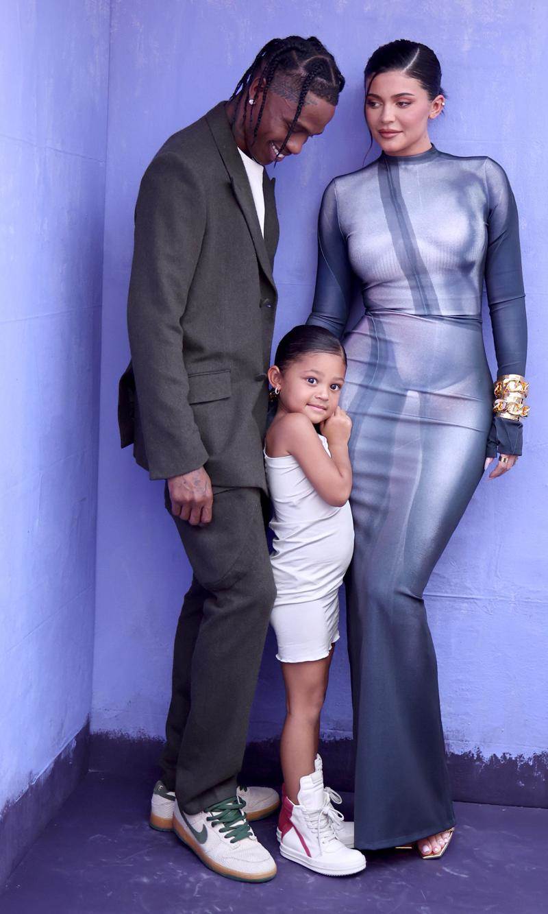 Para la ocasión, Kylie lució un espectacular —pero muy ajustado— vestido azul de Balmain, mientras que Travis optó por un traje con una camisa blanca y calzado deportivo. En tanto, la hija mayor de la pareja, se dejó ver con un vestido blanco asimétrico a la rodilla, con un par de sneackers.