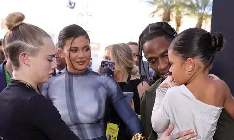 Sobre la alfombra roja, Kylie y Travis coincidieron con varios rostros familiares, como la modelo Cara Delevingne, quien se acercó a saludarlos. La supermodelo cayó rendida ante la ternura de Stormi y fue fotografiada haciéndole unos mimos y apapachos, mientras Travis la sostenía entre sus brazos.