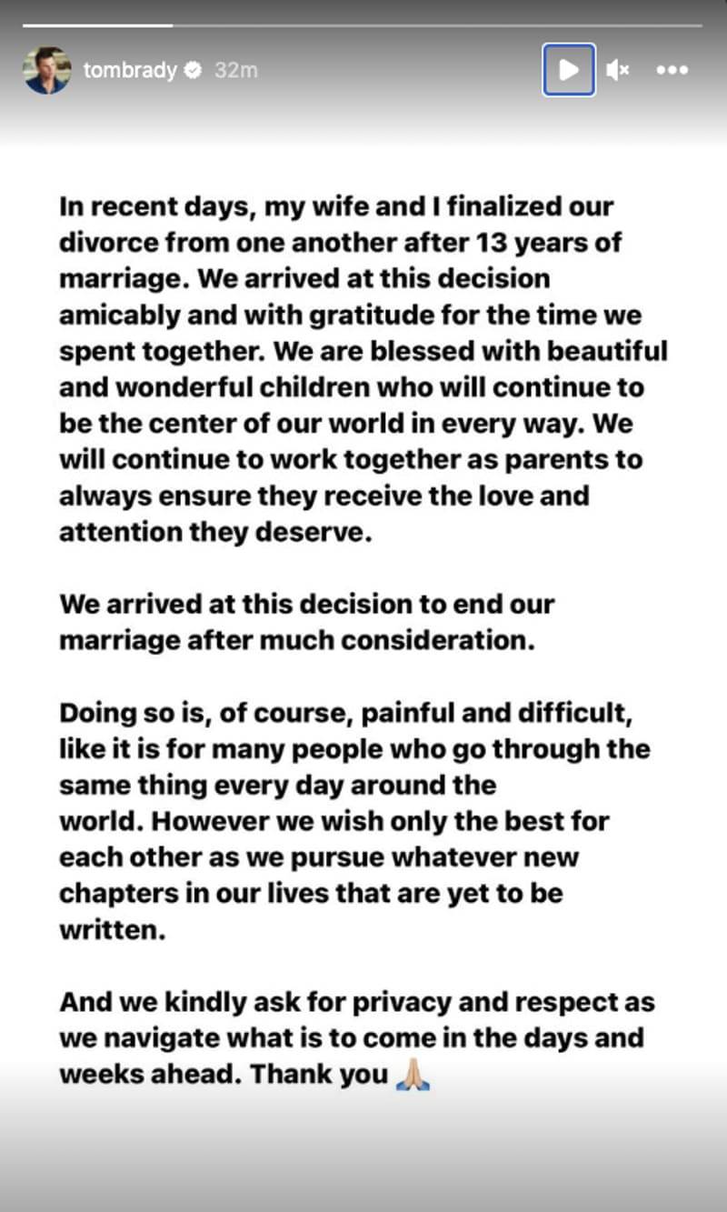 El legendario deportista de 45 años tomó por asalto sus redes sociales para confirmar su divorcio de la exmodelo por medio de un mensaje en el que pide respeto mientras superan esta difícil etapa. “Recientemente, mi esposa y yo terminamos nuestro divorcio después de 13 años de matrimonio. Hemos llegado a esta decisión de manera amigable y agradecidos por el tiempo que hemos compartido juntos”, comienza el escrito.