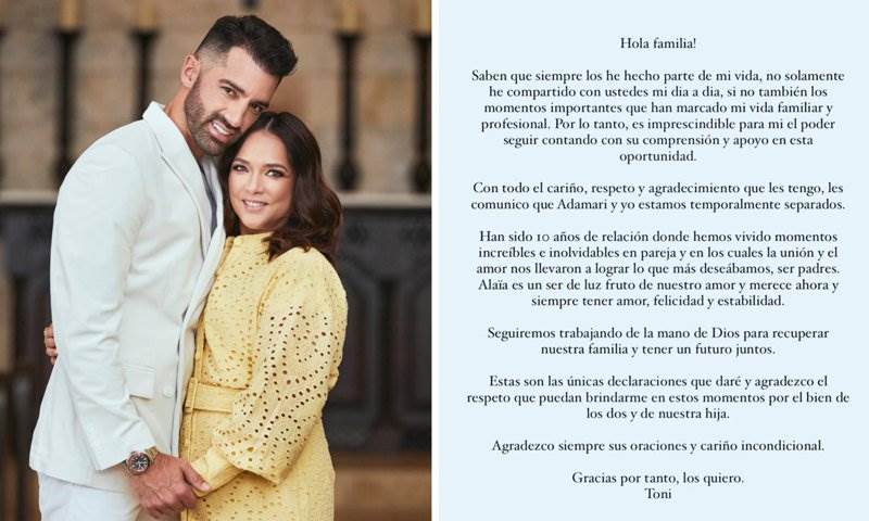 Toni agregó: “Con todo el cariño, respeto y agradecimiento que les tengo, les comunicado que Adamari y yo estamos temporalmente separados”. Sobre el futuro de su hija, Alaïa, expresó: “Han sido 10 años de relación donde hemos vivido momentos increíbles e inolvidables en pareja y en los cuales la unión y el amor nos llevaron a lograr lo que más deseábamos, ser padres. Alaïa es un ser de luz fruto de nuestro amor y merece ahora y siempre tener amor, felicidad y estabilidad”.