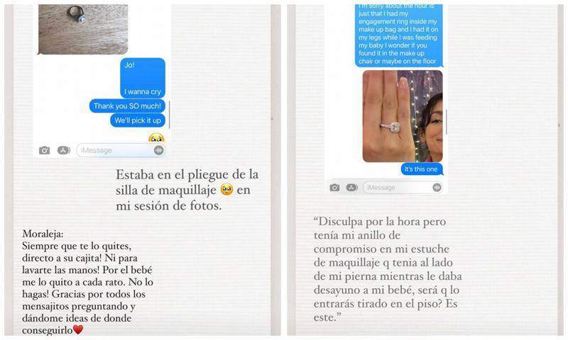Su última esperanza fue escribirle a la persona que horas antes le había hecho su maquillaje. “Disculpa por la hora, pero tenía mi anillo de compromiso en mi estuche de maquillaje que tenía al lado de mi pierna mientras le daba desayuno a mi bebé, ¿será que lo encontrarás tirado en el piso?”, se lee en el mensaje de texto que le mandó a la persona que la arregló horas antes. Además de eso, adjunto una foto de la joya en cuestión.