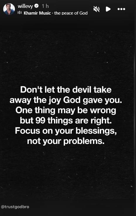 Este 24 de marzo, un día después de que publicara su primer posado junto a su nueva novia, William compartió en sus historias de Instagram un texto publicado originalmente en la cuenta TrustGodbro hace casi dos semanas. “No dejes que el diablo te quite la alegría que Dios te dio”, dice la primera parte del reflexivo mensaje escrito sobre un sencillo fondo negro.