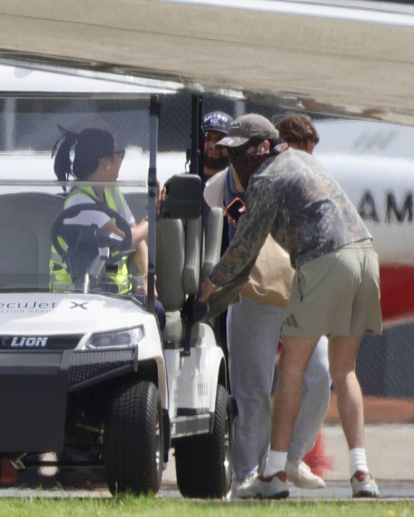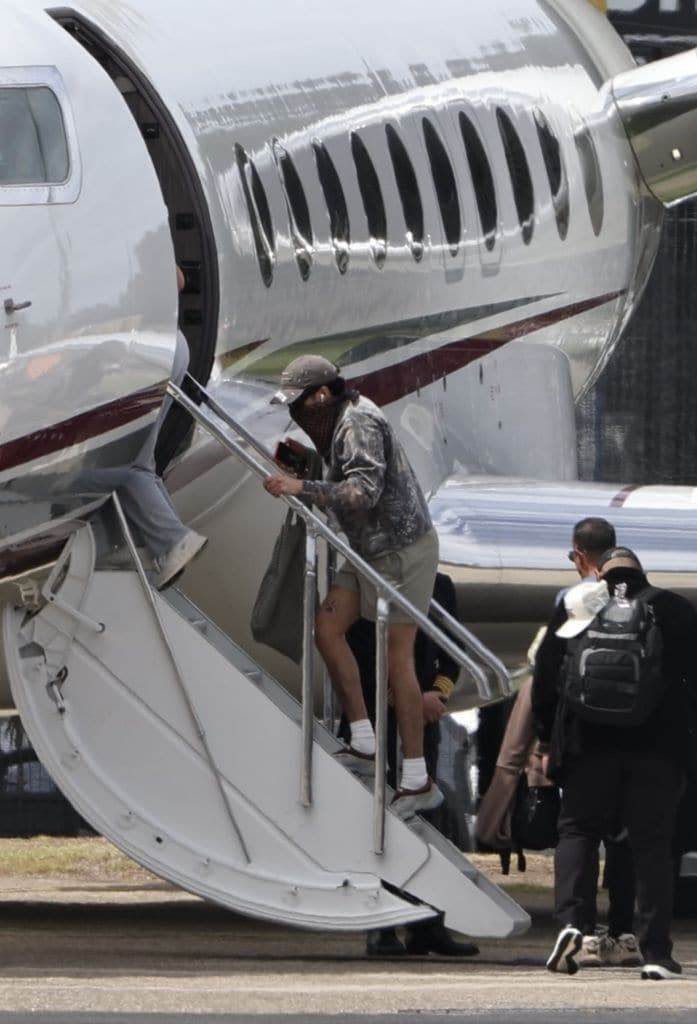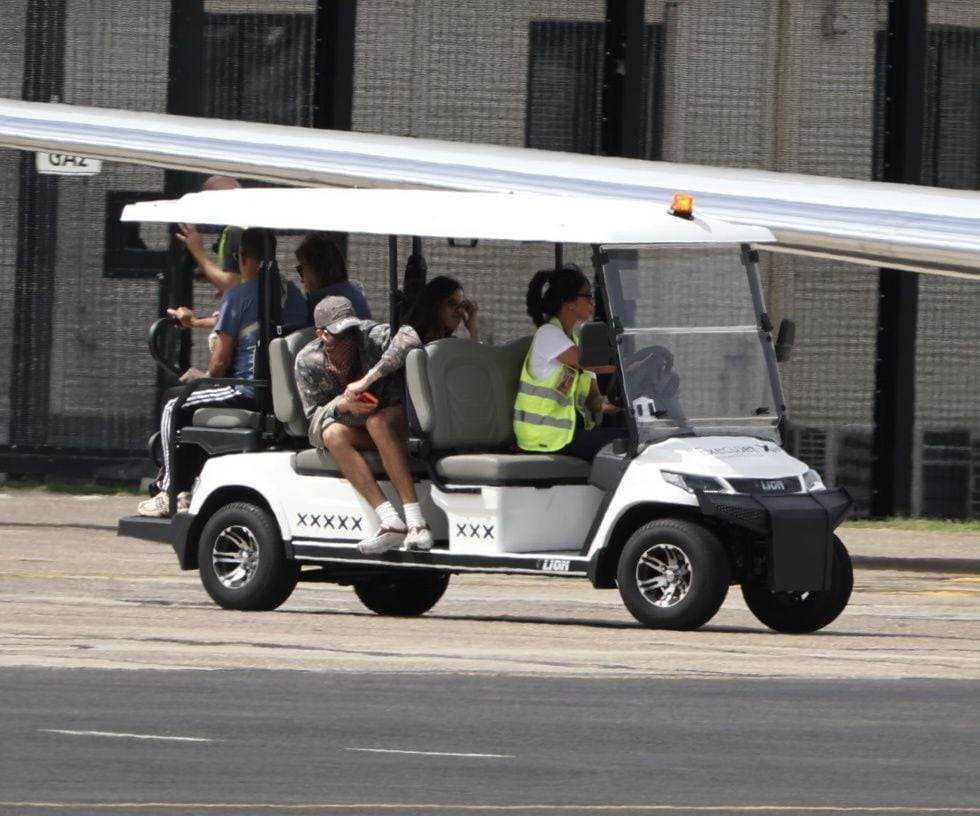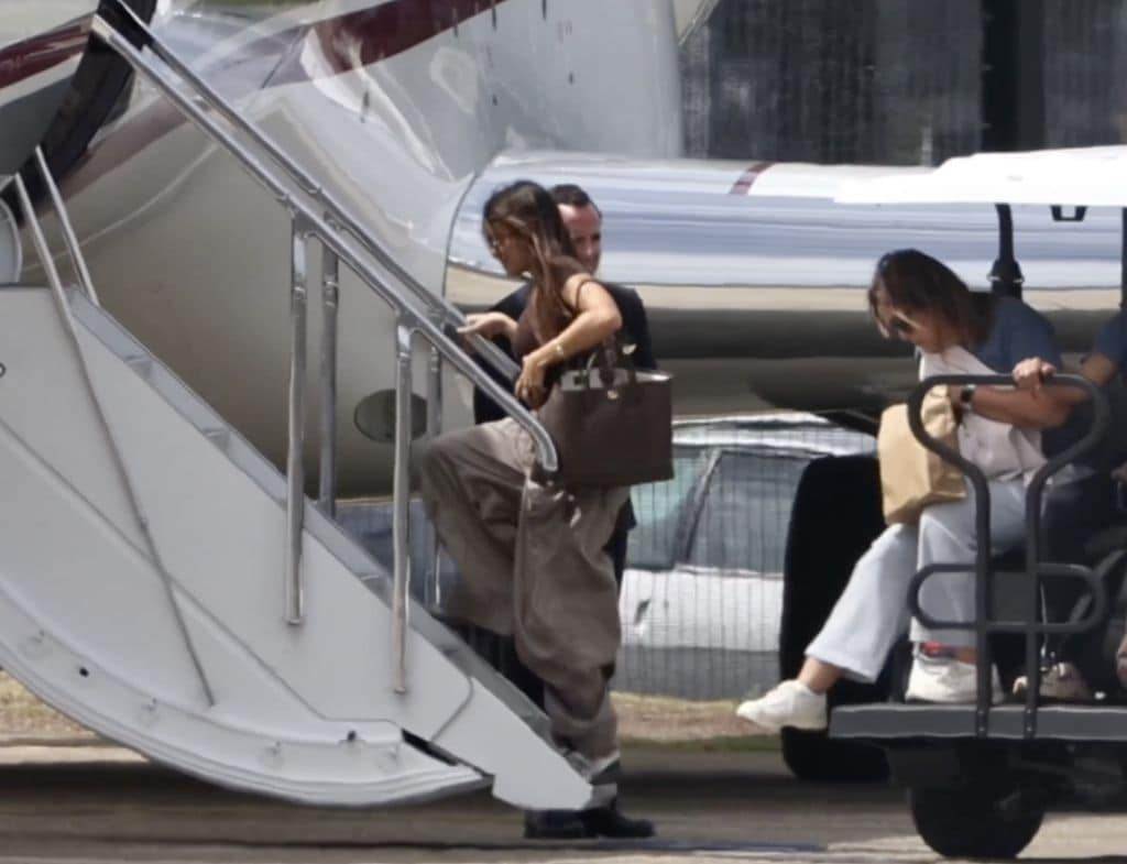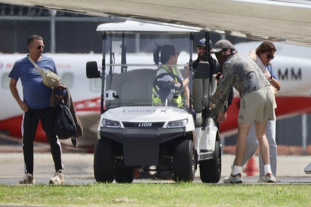 Gabriela, por su parte, usaba unos pantalones holgados color beige y un top marrón sin mangas, así como un bolso al nombro. Ella abordó la aeronave primero, y Bad Bunny la siguió poco después esperando que otra de sus acompañantes subiera también.