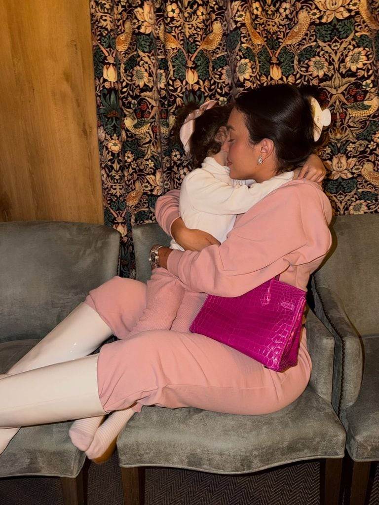Tras mostrar aquella pieza que muchas fashionistas anhelarían tener, ‘Gio’ mostró un tierno momento madre e hija junto a Bella Esmeralda, en el que también llamó la atención uno de sus costosos bolsos, esta vez un Birkinrosa de cocodrilo. La modelo, que usaba un conjunto deportivo rosa bebé, estaba sentada en un par de silla alineadas, abrazando a su nena quien estaba acomodada en su regazo y vestida en los mismos colores. Georgina tenía los ojos entrecerrados mientras su hija la rodeada por el cuello con sus bracitos.