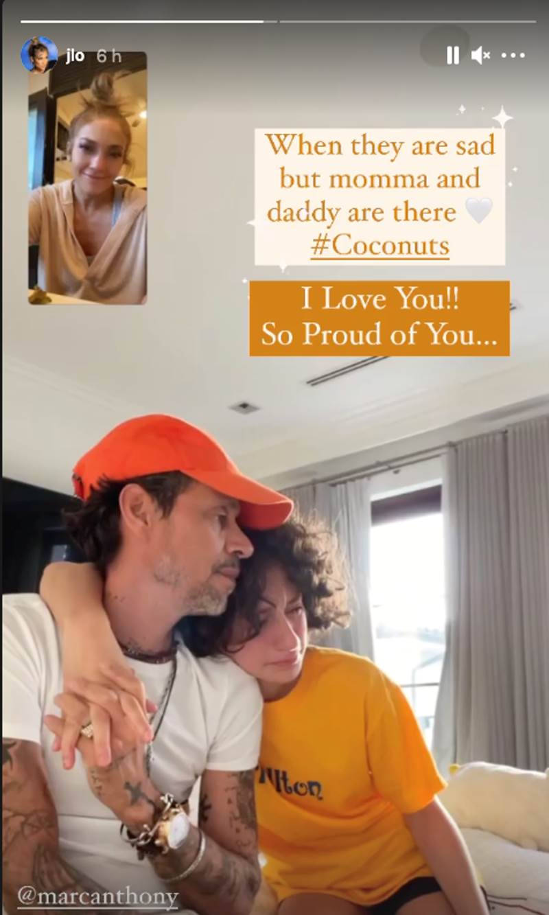 En una de las últimas publicaciones en sus redes, Jennifer Lopez compartió una imagen en la que aparece en una charla de video con su exesposo, Marc Anthony, quien a su vez sostiene a la hija que tienen en común, Emme, que se deja ver llorando junto a su padre. “Cuando ellos están tristes, pero mami y papi están ahí”, se lee en el mensaje.