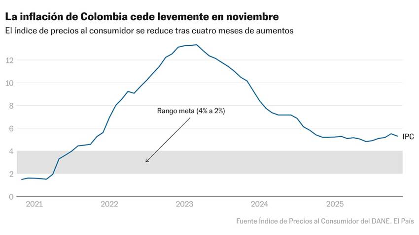 El alivio en el bolsillo de los colombianos es lento, incómodo y, sobre todo, insuficiente para declarar la victoria sobre la carestía. El DANE ha publicado este viernes el dato de inflación de noviembre, que deja la variación anual en el 5,3%. El retroceso es leve, pero queda en la lupa de todos los actores económicos porque esa cifra se convierte, de inmediato, en la base técnica para definir el ajuste del salario mínimo de 2026. El consenso del mercado —capturado por la encuesta de Citi a 26 entidades— anticipaba una desaceleración moderada hacia el 5,44%. El dato de este viernes representa una reducción de 21 puntos básicos frente al 5,51% de octubre que sacudió al mercado.