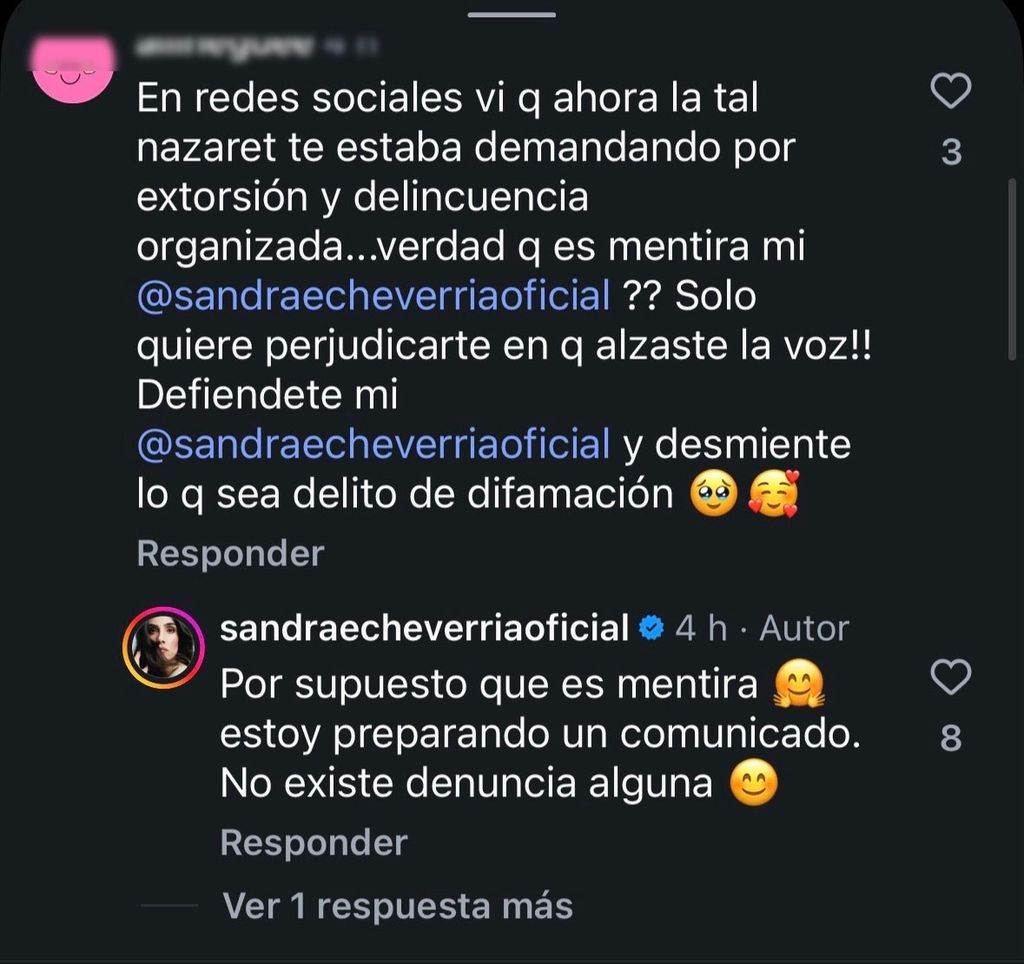 A través de su perfil de Instagram, la estrella de María Félix, la Doña compartió un video en el que instó a aquellas personas que habían sido víctimas de un fraude como ella, a que no guardaran silencio y denunciaran ante las autoridades. En la sección de comentarios, algunos usuarios le preguntaron acerca de la supuesta demanda de Nazaret 'N' en su contra, a lo que la actriz fue directa y respondió: "Por supuesto que es mentira. Estoy preparando un comunicado. No existe denuncia alguna".